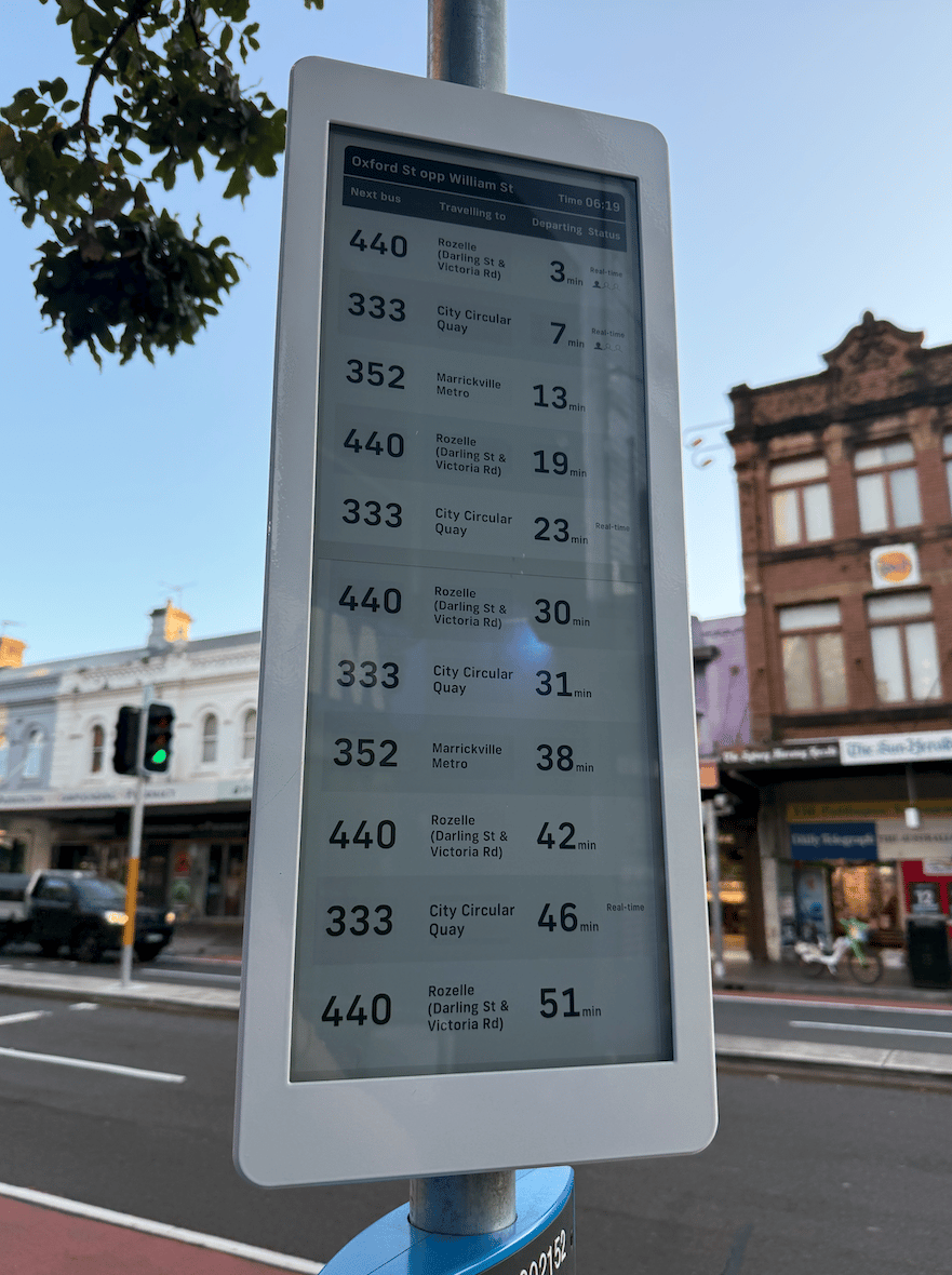 When I was walking around Paddington, Sydney, the other day, I noticed that the bus signs were actually e-ink displays with the schedule.