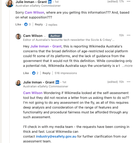 While not technically from a Sizzler, I figured I’d share that the eSafety Commissioner Julie Inman Grant had a strong reaction to Wikimedia Australia’s fears that it technically could come under the teen social media ban.