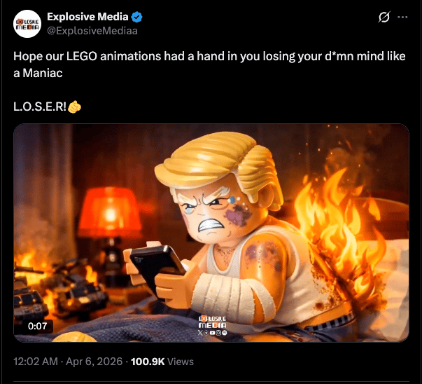 Move over sexy fruit, the latest hot AI video trend is Iranian Lego-style videos that humiliate the US (New Yorker)! YouTube and Instagram have taken down accounts belonging to Explosive Media, a group that claims to be student-run whose videos have been going viral since the US first struck Iran. Its juvenile AI-produced videos show Trump and Netanyahu figurines, reference Epstein, and have been backed with AI rap music tracks. What a time to be alive.