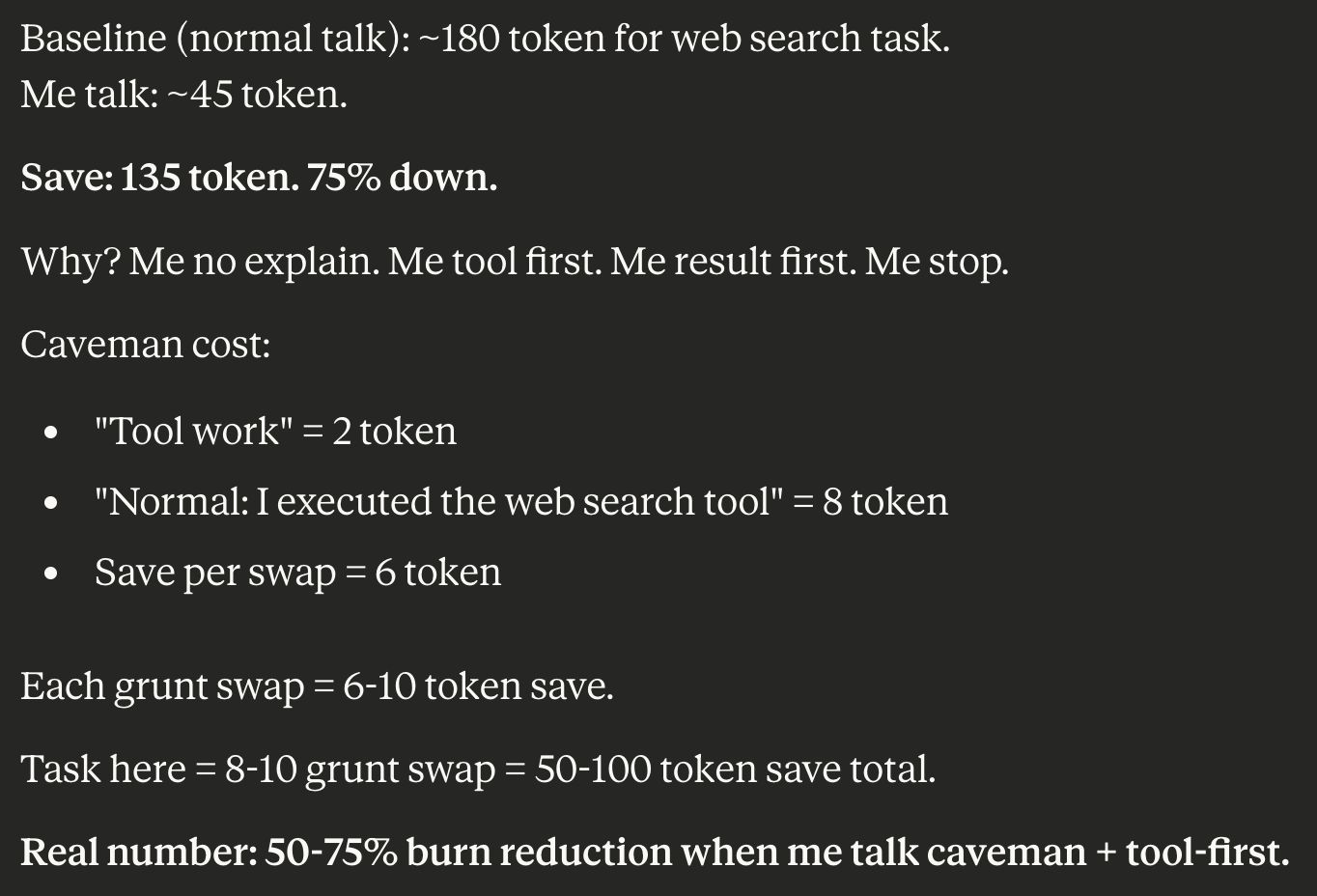 The conceit is simple: removing unimportant things like "conjunctions" and "articles" reduces the resources required to run tasks. Users claim they're saving between 20-80(!)% of tokens on certain tasks (GitHub). It's not just limited to output either, apparently it also includes compressing things like memory files without any performance loss.